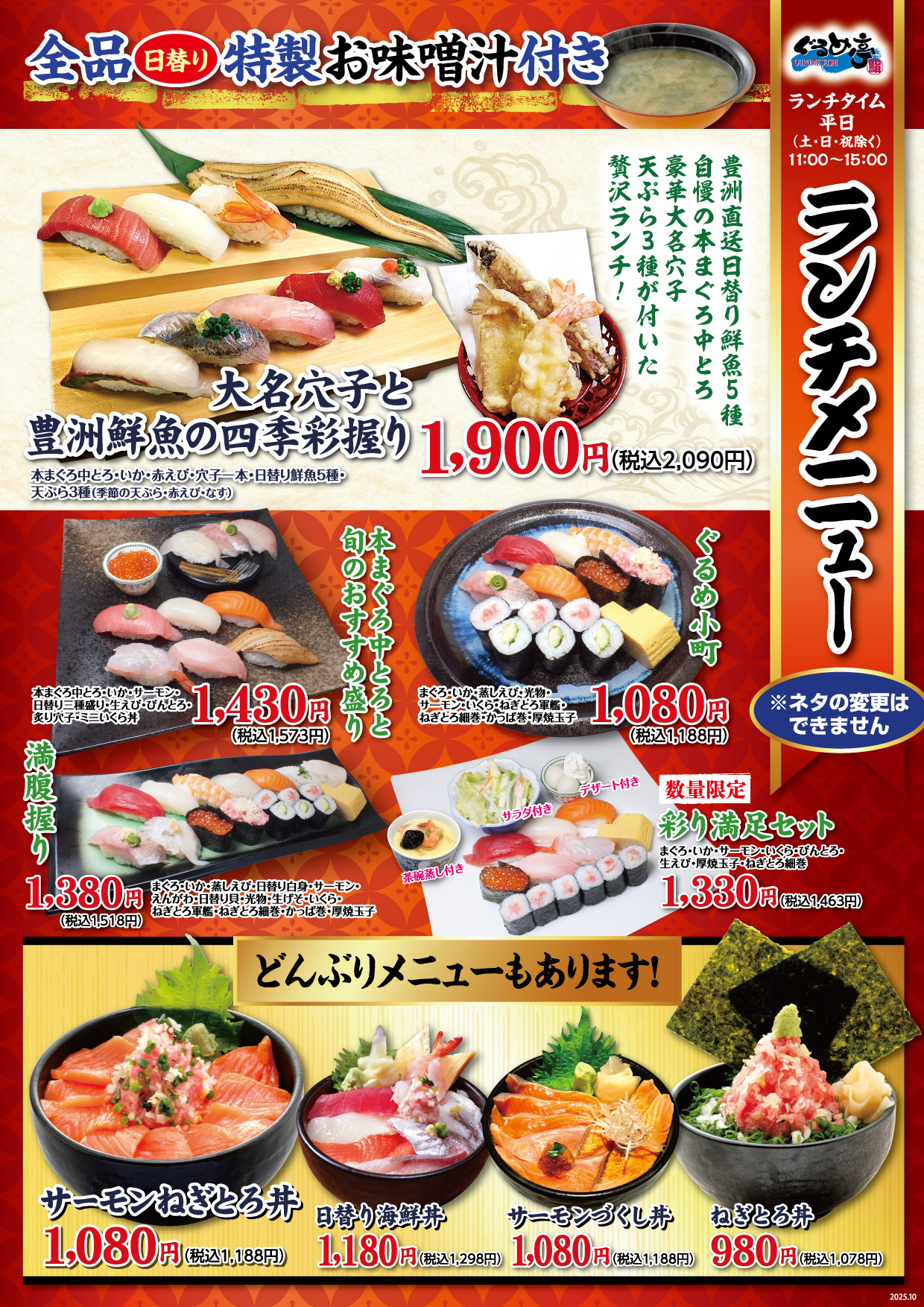 ぐるめ亭の平日限定ランチメニューです。海鮮丼、ねぎとろ丼やお得な握りセットもございます。ランチタイムはぐるめ亭各店へお越しください!平日限定11:00〜15:00 ※土・日・祝日は販売しておりません。 ※大名穴子と豊洲鮮魚の四季彩握りと彩り満足セットは店内販売のみとなります。(お持ち帰りはできません。)■ぐるめ亭霧が丘店 ■ぐるめ亭鶴見岸谷店 ■ぐるめ亭藤沢長後店■ぐるめ亭西谷店