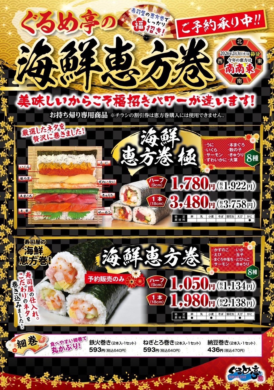 ぐるめ亭では、お寿司屋ならではの厳選ネタを贅沢に巻いた「恵方巻」のご予約を承っております。