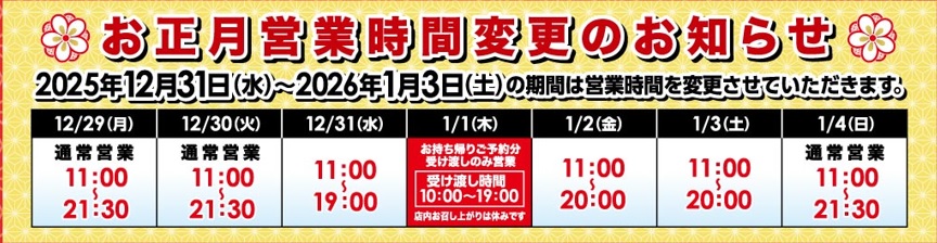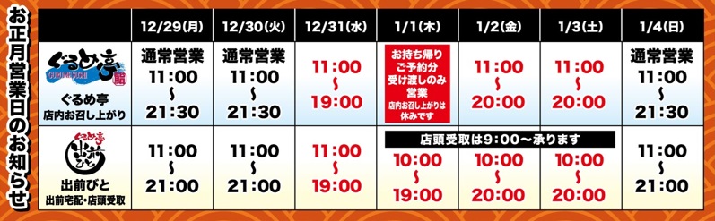 師走の候、ますますご健勝のこととお慶び申し上げます。 平素より格別のご高配を賜り厚く御礼申し上げます。 さて、ぐるめ亭では年末年始につきまして下記のとおりで営業いたします。■ぐるめ亭霧が丘店■ぐるめ亭鶴見岸谷店・藤沢長後店・西谷店■ぐるめ亭霧が丘店■ぐるめ亭鶴見岸谷店・藤沢長後店・西谷店■ぐるめ亭霧が丘店■ぐるめ亭鶴見岸谷店・藤沢長後店・西谷店 Facebook で共有するにはクリックしてください (新しいウィンドウで開きます) Facebook クリックして X で共有 (新しいウィンドウで開きます) X クリックして友達にメールでリンクを送信 (新しいウィンドウで開きます) メールアドレス こちらのページも読まれています